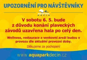 V SOBOTU 6. 5. 2023 UZAVŘOU PLAVECKÉ ZÁVODY VNITŘNÍ ČÁST HALY Plavecký klub Děčín si na sobotu 6. května pronajal celý prostor kryté haly, aby zde mohl uspořádat plavecké závody. Číst více » 22. 5. 2023
